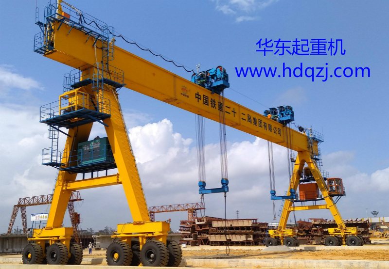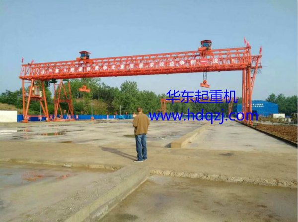 雙吊具提梁機是為一臺設備吊運較大橋梁使用的活動型雙鉤雙吊點提梁機,主要作用是單臺提梁機獨立把大型預制梁從制梁臺吊運到存梁臺位,完成預制梁養護后在單臺提梁機從存梁臺位獨自提吊至運梁車上。