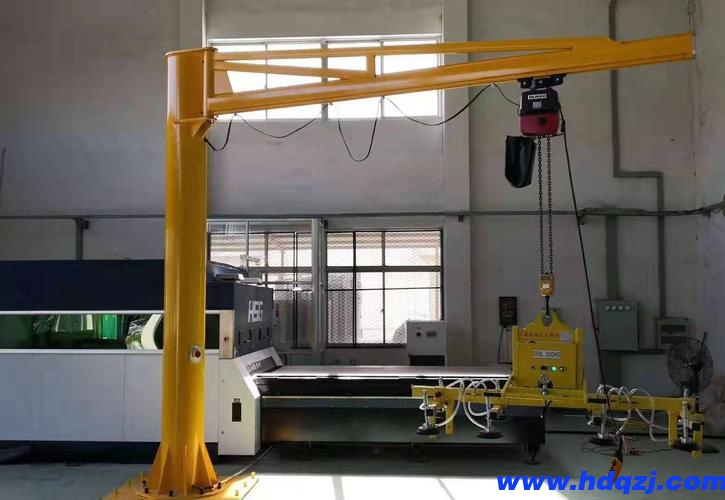 曲臂式旋臂起重機又稱曲臂吊,具 有結構新穎、伸屈自如、操作靈便、高效節能的特點。操作時,按動電鈕將載重物吊起,利用橫梁的彎曲和旋轉運動,在控制工作區域內避讓物體。用手輕輕推拉,便可達到作業區域的任一位置。曲臂吊適用于機械制造、鐵路、化工、輕工等行業的生產或維修場合,特別在設備稠密、短距離吊運、作業頻繁 的生產線上應用本產品更能提高生產效率。起重量125KG到500KG。