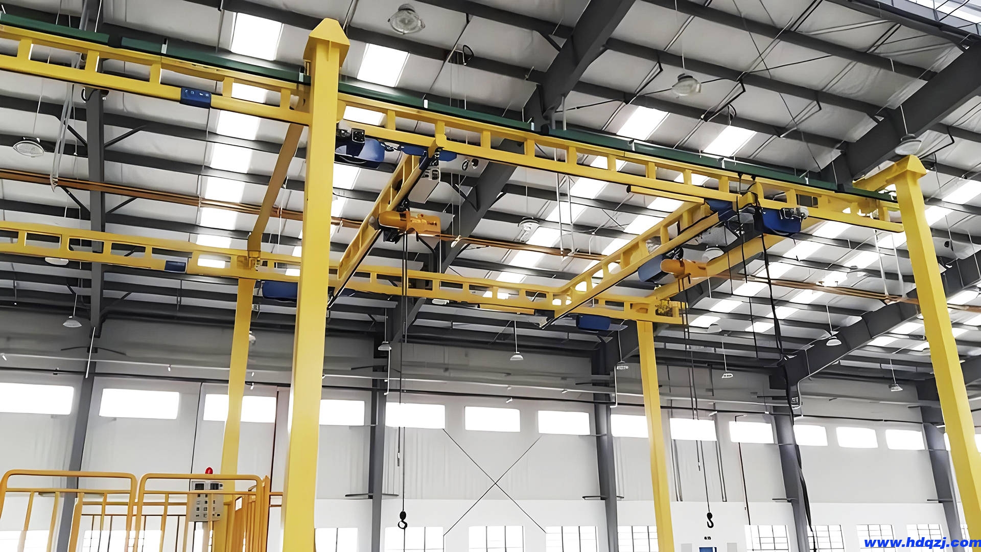 高強度軌道及可拓展桁架結構設計,使之整體不需要額外增加工字鋼懸掛,從而減少整體自重,起重能力可達2000kg。特別是桁架結構的優化可使間隔達9米,大幅減少立柱或支持件數量,減低空間干涉,使廠房布局美觀簡潔。