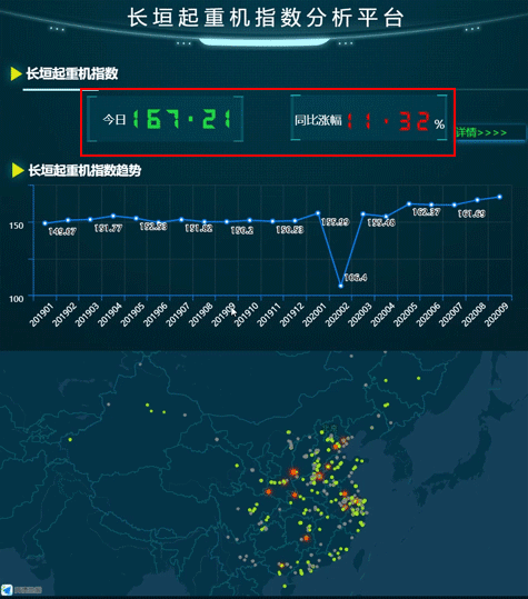 長垣起重機指數主要依據《GB/T 3811-2008 起重機設計規范》、《GB/T 28264-2017 起重機械安全監控管理系統》,借助物聯網技術,通過機載控制器、傳感器和無線通訊模塊,將起重機的實時工作數據回傳到“長垣起重機指數分析平臺”,利用大數據技術,實時分析起重機工作數據,再對數據賦予科學的權重比例計算得出,指數的平均值為150。 隨著我國統籌推進疫情防控和經濟社會發展各項工作,疫情防控形勢持續向好,復工復產加快推進。長垣起重機指數已從2月份的106.4上升到8月份的167.2,表明疫情之后中國經濟復蘇態勢明顯,龍門吊逆水行舟動力足!